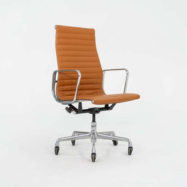 Eames Aluminum Group Executive Desk Chair. This particular example dates to the 2010s. The design features an adjustable aluminum 5-star base with a 360-degree swivel and is upholstered in cognac leather.